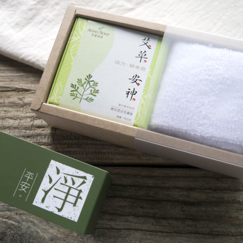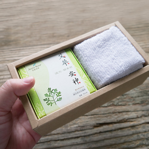 一塊「艾草精油皂」搭配輕巧潔白的「柔白方巾」風雅樸實的包裝,是最貼心的平安禮。